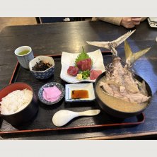 カツオがあると聞き、カツオ刺身定食を注文 味噌汁をあら汁に変えました!