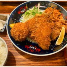 ミックスフライ定食。アジフライ・唐揚げ・コロッケにマヨネーズをトッピングしました。店内はモクモクですが、大繁盛しています。