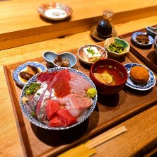 鵙の海鮮丼 ・6種海鮮丼 ・椎茸うま煮 ・こんにゃく甘辛煮 ・冷やっこ ・青菜のお浸し ・じゃがいもコロッケ ・スズキのあら汁 2025/11/15 昼食