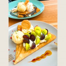 スイーツ系から軽食系まで幅広いラインナップで目移りしてしまいました👀” “モチモチの生地”はしっとりとして、季節のフルーツ、クリームやソースと絡み合って、食べ応えも抜群でした♪ テイクアウトのお店が多い中、イートインカフェは珍しいのでゆっくり食べたい方にはお勧めです 平日限定で食べ放題もありました