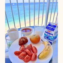 朝ごはん✨ 🏖️JAファーマーズマーケット内のさーたーあんだぎー屋さんで買った紅芋味のさーたーあんだぎー 🏖️紅桜 みかん🍊 道の駅許田で試食して買った、甘くて美味しいみかん 🏖️ 心ばなな🍌 グレイスファームの沖縄産オーガニックバナナ めっちゃ甘くて美味しい! 🏖️玉城牧場牛乳 今回はこの牛乳にした。濃厚で美味しかった! この牛乳パック、上の部分をチョキチョキ切って、残ったバナナを持って帰るのにピッタリだった😆 あとは、紅茶とカフェ・オ・レとトマトと素敵な景色♡