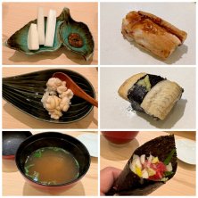 山芋と大根の箸休め 煮穴子 白子のリゾット 鰻白焼 赤出汁 とろたく巻 焼き白子はシャリとよくまぜて酢橘とワサビでいただきます。赤出汁の出汁がとっても深いお味で美味しい。