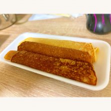 首里リュウボウの中にある、花ぐすく香華堂で、ちんぴんと、ぽーぽーを買いました。 ちんぴんは手前側の黒い黒糖味のクレープで、ぽーぽーは奥側にある油味噌が巻かれているクレープです。 ちんぴんは黒糖の優しくて濃く深い甘さが食べやすく美味しかったです。 対してぽーぽーは脂味噌の円味がしっかりと効いたおかずクレープでした。 これを食べるには牛乳が1番合うと思います。 沖縄の素朴な味、美味しかったです。