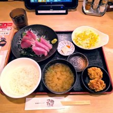 刺身(キハダマグロ、鰤)&唐揚げ定食 ¥1,050 美容院の帰りにパスタ食べよっかなーといつものポポラマーマ行ったら、すっごい並んでてびっくり∑(๑º口º๑)!! え……なんかお得なことでもあるの?と思いつつ、並ぶのは嫌だったので、隣の居酒屋でランチ。 美味しかった! 今度は、焼き鯖定食や生姜焼き定食食べたいな。 それにしても、北風が凄まじくて震えたよ……。
