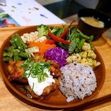 お野菜たっぷりのタニタカフェ+さんのランチ♪ 1日の半分量の野菜が摂れます。 ごはんは十六穀米 メインはチキン南蛮 チョイスデリは、インゲンとキノコのマリネ、カリフラワーのマリネ
