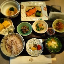 和定食 水菜浸し🥬 昆布イリチー 牛蒡金平 水雲酢 鮭汐焼き🐟 だし巻き玉子🐣 冬瓜含め焼湯葉鶏そぼろ餡🐔 五穀🍚 信州味噌仕立て