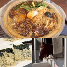 おひるごはん★ 味噌煮込みうどん と 海苔の天ぷら 近場の馬場で お馬さんたちの様子を見ながら散歩。 いつ見ても彼らの優しい瞳に癒されます。