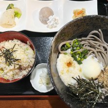 温玉とろろそば+丼セット 930円 そばは太くて堅いタイプで得意ではなかったものの食べ応えはあった。 コスパはいい。 丼は鴨肉の混ぜご飯。
