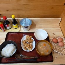たまごかけご飯と豚汁と唐揚げのセット 豚汁がすごい多い(笑) でもたまごあと2個追加!