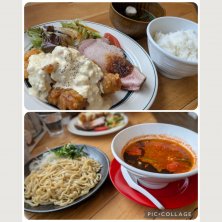 結構最近出来て評判の良いお店 初めて入っってみました。 奥さんはチキン南蛮とローストポークのあい盛りのセット 自分はトマトつけ麺に追い飯 奥さんの定食、結構なボリューム デカい唐揚げ3個に厚めで大きなローストポーク これは奥さん無理だな(笑) トマトつけ麺は富士麺の十字麺 断面が十字でスープが絡む一時期話題になってた麺 モチモチで美味しい。 結構つけ麺もボリューム有って追い飯は要らなかったか やっぱり奥さんからチキン南蛮流れてきました 美味しいけど腹一杯でキツ