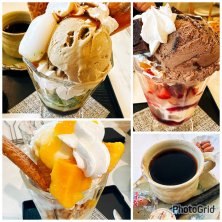 ゴルフ帰りのティータイム 私はミニ茶々パフェとブレンドのセット880円 他のお仲間のチョイスは ミニガトーショコラベリーパフェ ミニマンゴーパフェ 茶々パフェには安納芋のスイートポテト、みたらし団子、ほうじ茶アイス、抹茶アイス、抹茶のババロアなとなど、いろんなものが盛りだくさんに入って大満足!ミニとは名ばかりでボリューム満点でした。 ブレンドもサイフォンで丁寧に淹れていて雑味のないとっても美味しいコーヒーでした。 帰り道でたまたま入ったカフェでしたがとても良かったのでリピート決定〜