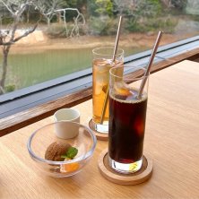 久山Nayuta♨️施設内にある展望カフェでお茶して、薪サウナ🪵満喫してきた!紅葉🍁がいい季節の時にまた来たいね、今の時期は枯れてて、この日は曇りだったけん☁️😅 ꕤアイスコーヒー ꕤダージリン ꕤソルトキャラメルジェラート