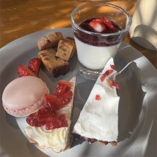 初彩(はついろ)デザートプレート ミックスベリーのベイクドタルト いちごのレアチーズタルト ブランマンジェとベリーソース KUTEN。自慢の焼き菓子/ いちご 紅白マカロン(ベリーのバタークリーム) 半年ぶり位のコーヒーも本当に美味しくて身に沁みます。 今日はすでに3000歩も歩いています。 盆明けに体調を崩して心臓の調子が悪くなってから全く歩けなくなったのですが今日はかなりゆっくりのペースながらも歩くことが出来て本当に嬉しいです。 このお店で休んでたらもう少し歩いてみましょう😋