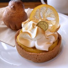 朝おやつ〜 ・タルトシトロン ・ブリオッシュアテット 酸味レベル ☆☆☆ サクサクでキュンと酸味の効いたやや固めレモンクリームとたっぷりのメレンゲが美味しい! 飾られたレモンコンフィもおいしい パンをイートインするとリベイクしてくれるし、カフェ・オ・レがたっぷりなのも嬉しい!