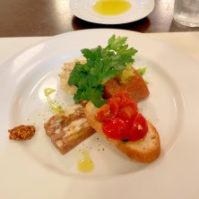 前菜 キャロルセブントマトのブルスケッタ 豚足とベーコンの煮凍り 新じゃがと鶏ミンチのポテトサラダ サーモンの燻製