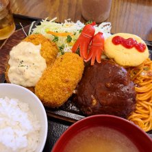 洋食ミックスプレート 1,800円 グラタンコロッケ タルタルチキンカツ デミソースハンバーグ ミニオムレツ スパゲッティナポリタン タコさんウインナー ごはん 味噌汁 ひじき煮 白菜漬け お腹いっぱい…(^^)