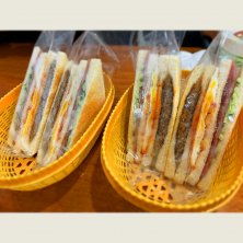 朝ごはん屋のサンドイッチを4人だから4個注文したところ、写真の1カゴに入ったもので1人前とな。 多すぎるので、2個にして4人で食べましたとさ。
