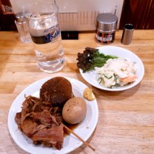 おでん(牛スジ、大根、糸こん、玉子)、ポテトサラダ&芋焼酎お湯割