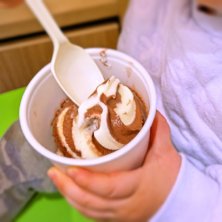 チョコバニラソフト 保護者会の所用を済ませ、おやつにソフトクリーム。私はゆずソフト。女性の店員さんがあれこれ気を遣ってくださって、本当にありがたかったです。 美味しそうなおむすびがショーケースにたくさん並んでました。今度来る時はおむすび食べよ!