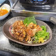 福岡県 野芥駅 富きよ 都城直送地鶏たたき 1000 左半分がもも、右が胸 にんにくたっぷりのタレがかかってる