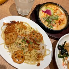 *海老とアボカドのドリア ハーフセット¥1,680 *ハーフパスタ【宮城県産蓮根とアンチョビのパスタ】 *サラダバー +¥490