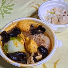 晩御飯1/3 【UberEats/七宝麻辣湯】 ●日替わりスープ春雨+豚しゃぶご飯 1,710円 カスター無し、ピリ辛 0円 追加鶏肉 220円 追加水餃子 210円