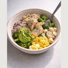 【朝食】 クリスプサラダワークス カスタムサラダ ロメインレタス ほうれん草 ワイルドライス🌾 豆腐 スパイシーブロッコリー🥦 チキン🐔 アボカド🥑 グリルドサーモン🐟 ボイルドエッグ🥚 クリーミーシラチャードレッシング