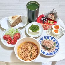 晩ご飯😃 辛ラーメン 焼きそば🌶️🌶️😋 ほうれん草のお浸し😋 めかぶ豆腐😋 ゆで玉子🥚 トマト🍅ブロッコリースーパースプラウト😋 NISHIMURA FARM…🥕米粉のキャロットケーキ😋 温かい青汁😋