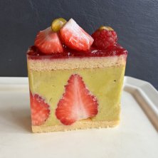 おやつフレジエ〜 ・フレジエピスターシュ しっとりふわ食感の生地、しっかり固くナッティでなめらかなピスタチオのムースリーヌ、中まで赤く大粒ないちご、トップはフランボワーズのコンフィチュール 美味しいねぇぇーーー!!!