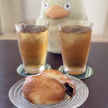 バイク屋さんに行って戻ってきたら、もう汗びっしょり(^^;; 体力回復に、アイスティーとともに、買ってきたチョコベーグルを軽くリベイクしていただきます ←食欲は問題ない! ここのベーグルのチョコは、ビターでオトナの味だなぁ♡