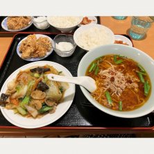 海鮮炒めセット 量多い😅 大きな唐揚げまで付いて 食べきれなかった唐揚げ 海鮮炒めお持ち帰り😅