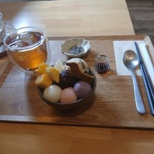 プリン🍮やショートケーキ🍰もすてがたい‼️ あんみつ八景にしました(爆)(@^^)/~~~😋🍴💕 パッチワーク販売もしてるようですね☀️