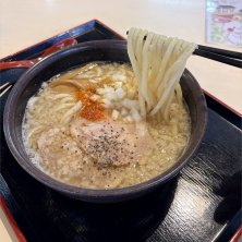 弥彦 おもてなし広場 背脂うどん フードコートのおうどん なにも背脂じゃなくても〜と思うが、なかなか美味しい 弥彦は讃岐と姉妹都市になっているそうで、本格的な讃岐うどんが食べられる ちょっと高いが美味しい
