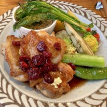 ここは素晴らしい! 値段はそれなりだが、ドリンクやデザートも付いてる ( ^ω^ )メインはチキンだが温野菜が珍しいメンツで、満足