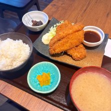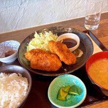 ◆アジフライ定食(日替わり定食)1,300円 今日の日替わり定食はカキフライ定食で牡蠣が4個。 よくある楕円形の冷凍牡蠣フライではなく、蠣殻からをむいた牡蠣の形状そのままフライにされていて衣がサクサクで牡蠣はジューシーで美味しい。