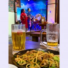 三線ライブ聴きながら夕飯 八重山そばを使った塩焼きそばが美味しかった オット、本日誕生日で 三線ライブのリクエストでhappy birthdayお願いしたら歌ってくれて最後にお客さんにたくさん祝ってもらってた✨