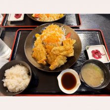 大分名物とり天定食 味付きの唐揚げに 慣れてるので少し違和感 天つゆ、塩、カラシ