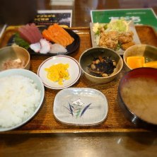 ランチ御膳(小ライス)¥1350 気になっていたお店へ。 お刺身(マグロ赤身、サーモン、タコ、鯛)、唐揚げ、冷奴、ひじき、お味噌汁、たくわん、オレンジ。