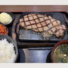 このお店のコスパはすごい! ごはん、みそ汁、キムチ、高菜、ワカメ、そぼろがお代わり自由! お肉はサーロイン!マッシュポテトを追加! これで1,000円ちょいです!