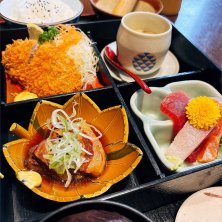 お休みの日のランチ 花亭膳ランチ 一口カツ、お刺身、角煮、茶碗蒸し、お漬物、豚汁、ご飯、飲み物もついて1400円 ラグビー前のランチは初めてのお店で😊 とんかつとお刺身が美味しいとのクチコミでこちらに寄ってみました。 リーズナブルで美味しゅうございました。 さて、雨の中のラグビー観戦、気合い入れないと辛いなぁ