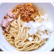 千葉県松戸市 松戸市役所の付近に有るラーメンの店、らぁめん かじの葉のにぼしの和え玉。煮干しの出汁を加えた自家製の細麺に角切りのチャーシュー、フライドオニオンと玉葱を加えた替玉ラーメン。先ずはしっかりと混ぜて油そば風に、次にラーメンのスープを加えて果実酢と胡椒をかけるのがオススメの食べ方。自分としては油そば風で食べるのが1番美味かったと思う。煮干しの出汁の味わいが堪らない。ラーメンのスープに入れると薄く感じて何だか物足りなかった。