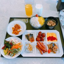◆和洋食バイキング 1,300円(税込) 近所のローカルホテルの朝食バイキング、一般外来客も利用できます。 いやはやなんとも驚きの超ハイコスパ! いただいた料理は ①野菜サラダ②マカロニサラダ③鯖の塩焼き④肉団子⑤スクランブルエッグ⑥筑前煮⑦ウィンナー⑧シラスおろし⑨福神漬け⑩沢庵⑪梅干し⑫味付海苔⑬ごはん⑭味噌汁⑮シリアル⑯オレンジジュース⑰牛乳⑱コーヒー 他にも色々あって決して高級ではなく一般的な料理ばかりですが味はどれもとても美味でした。特に筑前煮が美味しくてご飯と一緒に3回お替り♫