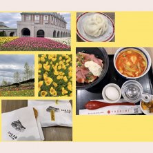 ランチ✨娘と〜♫ 高速を降りると 神戸フルーツフラワーパークが見え 急遽 お花を見たくて寄りました 今の時期ならチューリップ🌷と思っていましたが 大好きなポピーも色とりどり咲いていて感激💫 (写真中央左端) 勿論チューリップは赤白黄色🌷綺麗に咲いてました (写真2枚) ランチしようかと思いましたが お店があまり無く三田プレミアムアウトレットでランチ ローストビーフ&マーラータンセット 豚まん ビーフコロッケ&カレーコロッケ