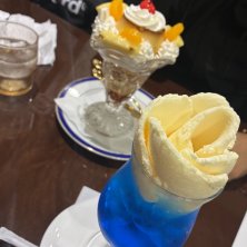 クリームソーダ~♪900円 お久し振りにのシュワ活です🍹 昨年からの宿題のシュワを飲みに来てみました! 程なく運ばれて来たのは薔薇の青いシュワシュワ♪ 見た目も綺麗でバッチリですね(*´∀`*)🌹✨ 薔薇の花びらはミルキーなバニラアイスで、青いシュワはブルーハワイ味のシロップをソーダで割ったもの。 シュワ度低めで結構甘いです(^_^; 値段高めの設定ですが、髙島屋の中にあるし作る手間もかかるから、まぁ仕方がないのかな~? 指定すれば緑色の薔薇シュワにも出来るそうですよー( ・ㅂ・)و