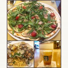 世界陸上開幕の日。 ブルーインパルスを見に行こうと家を出たけど、駅に着いたところで中止がわかり、行先変更でこちらでランチ。 店名と同じ名前のピッツァ。 ルッコラ、生ハム、ナス、トマトのピッツァ。 パスタは、ボンゴレビアンコ。 食後は、スタバで「ほうじ茶香る 焼き芋 ムース ティー ラテ」」 去年の、さつまいもチップが乗ったフラペチーノの方が美味しかったかも。 これはこれで良いけど。