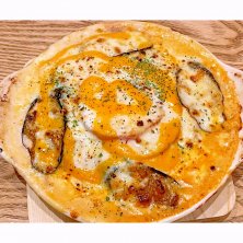 東京都と神奈川県に有るカフェの店、めん、色いろ。いつでも、おやつの茄子とミートソースのチーズフォンデュグラタン。たっぷり入ったチーズフォンデュに茄子、ミートソース、ポテトを入れたグラタン饂飩。