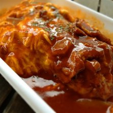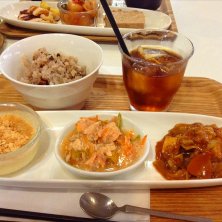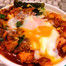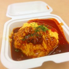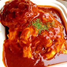 ビーフデミグラスソースのオムライスのハンバーグ乗せ