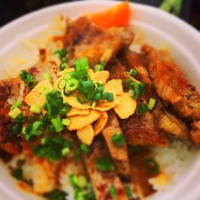 ステーキ丼 上に乗ったニンニクがいいアクセント