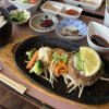 近江牛のステーキ定食、左上の鉄板の上に乗っているのは赤コンニャクです。