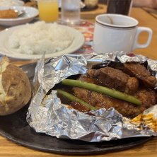 今晩は〜(^-^)/ 梅雨明けました〜(^з^)-♪ 今日も暑かったですね〜 母と娘と3人で買物して実家に帰ったら父が植木に水をあげてて、娘が車洗えば⁉️と突然言い出して…そうね〜と水洗いして汚れ落し拭きあけて来ました❣️気分スッキリしたけど汗びっしょり(^_^;)帰って親子でシャワー浴びました❣️ 今夜はココスで夕ご飯 ♡包み焼きハンバーグ+洋食セット ♡やみつきカリカリポテト